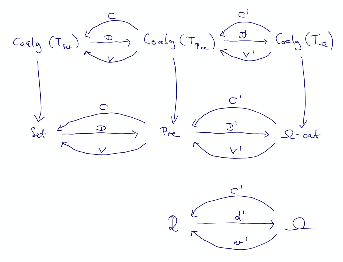 Cospan (bi)simulations allow us to see ordinary coalgebraic bisimulations as well as quantale enriched ones in the same framwork. The basic picture, taken from Section 4 of [BKV19] is as follows. take, respectively, connected components, discrete preorders and underlying sets. They lift via doctrinal adjunction to coalgebras since the right adjoints satisfy and .